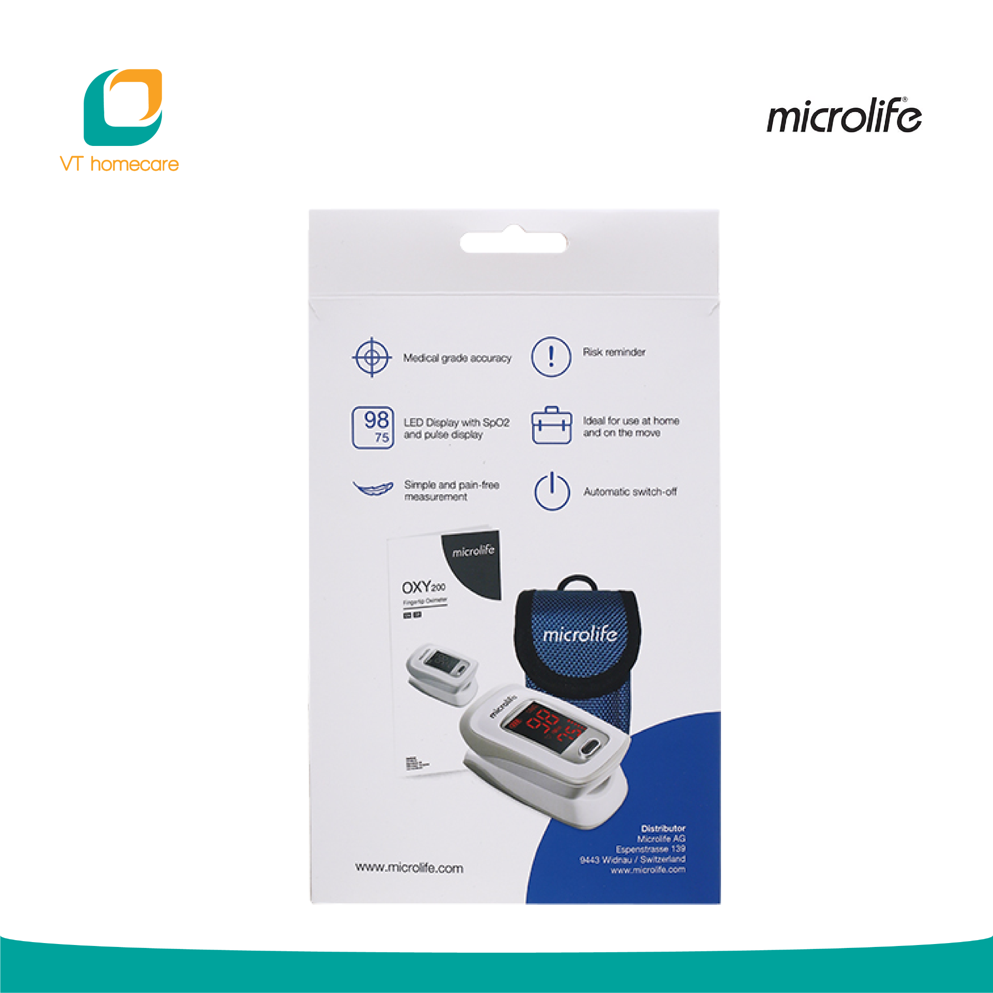 Máy đo nồng độ Oxy của Microlife – OXY 200 ứng dụng cảm biến quang học khi áp vào da. Ánh sáng từ cảm biến sẽ chiếu xuyên qua da để phát hiện màu sắc của máu, từ đó tính toán nồng độ oxy.