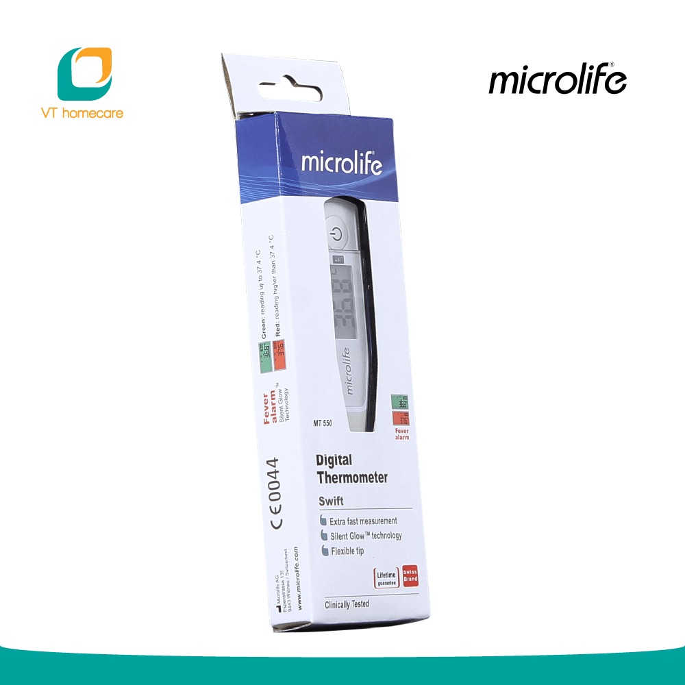 Nhiệt kế điện tử Microlife MT 550 là giải pháp thay thế nhiệt kế Thủy ngân, cảm ứng nhiệt bằng công nghệ đầu dò vàng GoldTerm không gây dị ứng và cho kết quả nhanh chỉ trong 10 giây, chất lượng được khẳng định qua hơn 30 năm, chính sách bảo hành trọn đời.